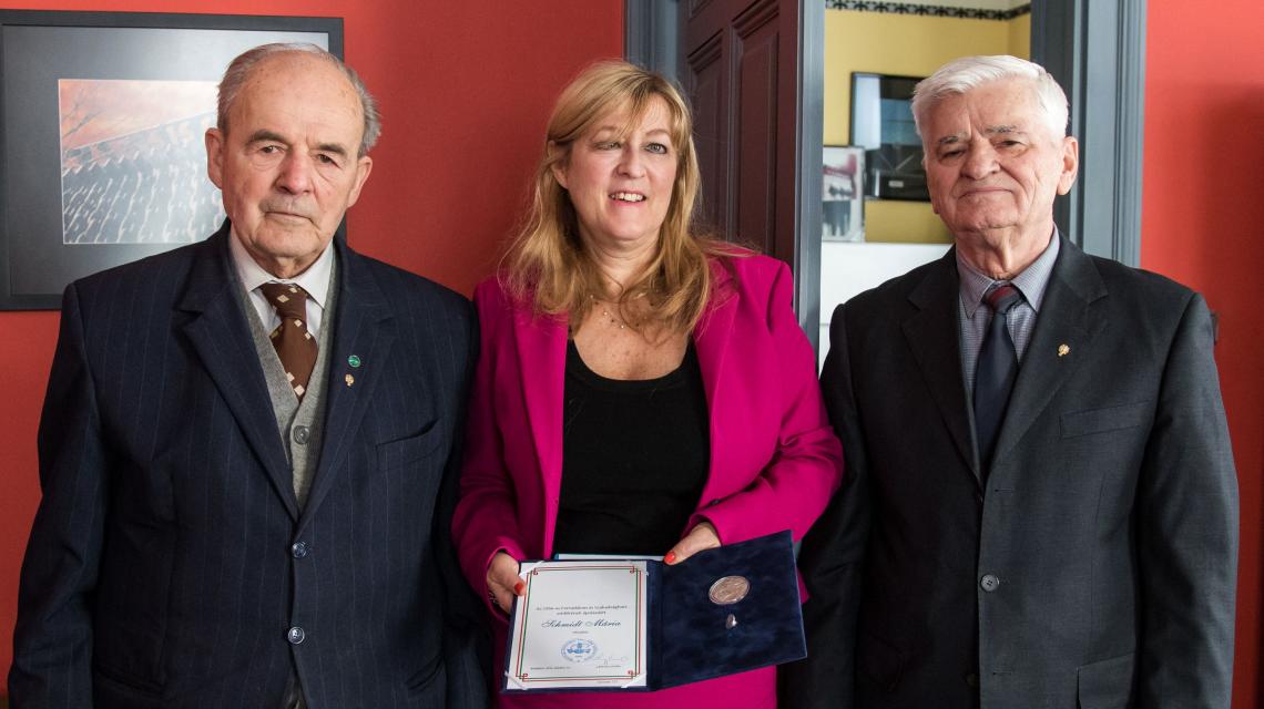 Schmidt Máriának Lengyel János, a POFOSZ országos elnöke és Forgács János, kitüntetésekért felelős elnökhelyettes adta át az elismerést a Terror Háza Múzeumban.