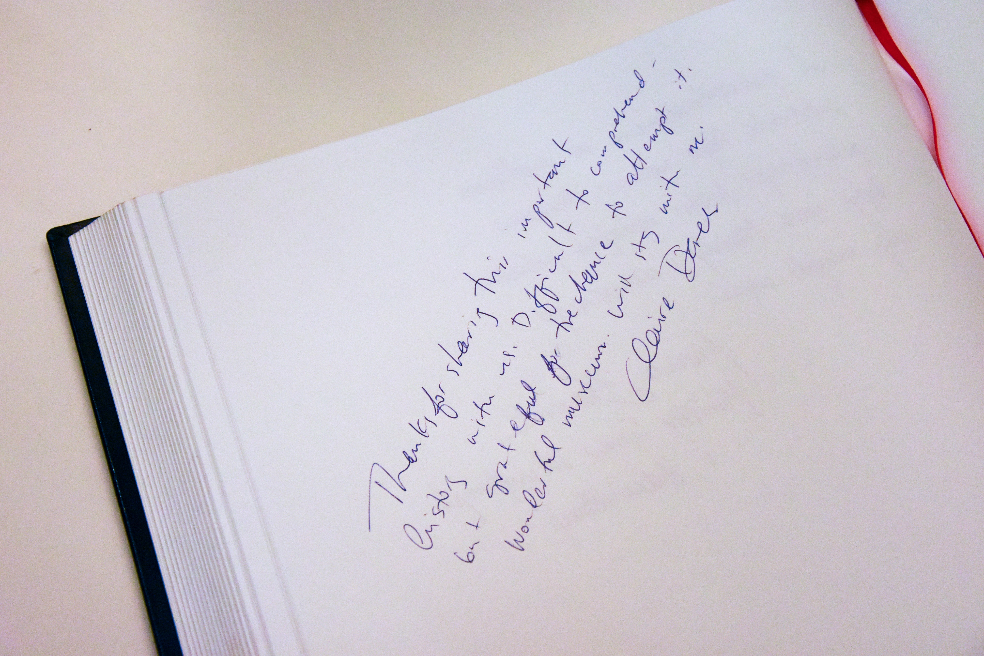 „Köszönöm, hogy megosztották a történelemnek ezt a fontos időszakát. Nehéz mindezt megérteni, de hálás vagyok a lehetőségért, hogy megkísérelhettem. Csodálatos múzeum, az emléke velem marad. Claire Danes / Thank you for sharing this important history with us. Difficult to comprehend - but grateful for the chance to attempt it. Wonderful museum. Will stay with me. Claire Danes”