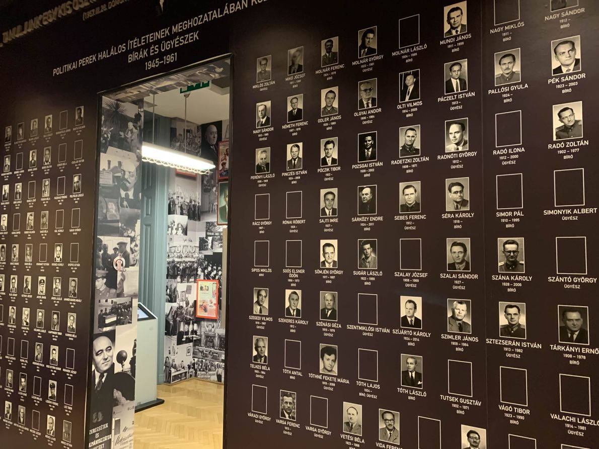 Az Igazságszolgáltatás termében, a bírói pulpitus mögötti fekete falszakaszon 172 egykori bíró és ügyész nevét és néhány kivételtől eltekintve fotóját tekinthetjük meg. A falon szereplők felelősek a politikai okokból, pártállami érdekből meghozott halálos ítéletekért és életfogytiglani börtönbüntetésekért.