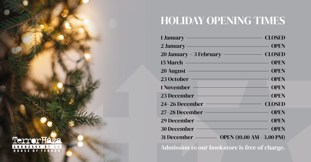 The House of Terror Museum will be open according to the following opening hours during the Christmas and New Year period.