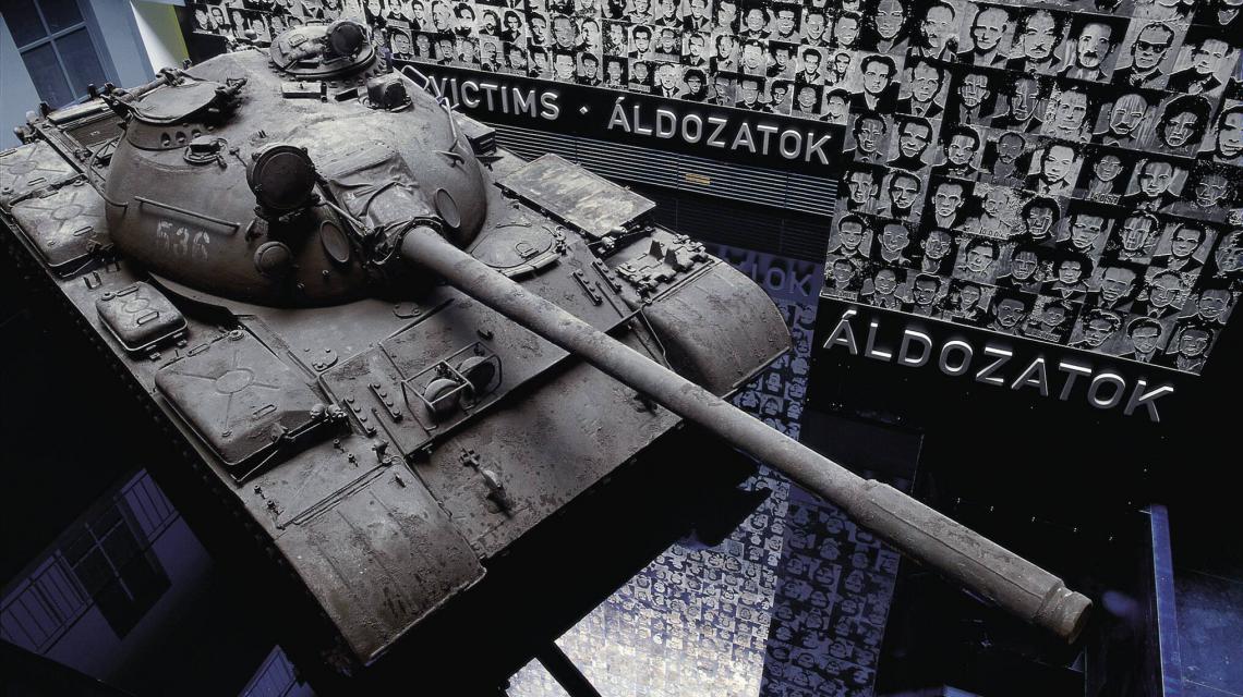The two marble memorial slabs at the steps in the entrance hall and the short documentary played in the lobby, the interior of the café, the documentaries shown on the screens on the wall and the tank in the yard all warn us about one thing: this block of flats is not a usual one, similarly to this dark period of history which is presented in relation to the history of this block. The set of statues in the stairway allude to the contorted and bitter tragicomedy of dictatorships, to illustrate how lame and ridiculous their effort was to force their own way on the order of creation.
