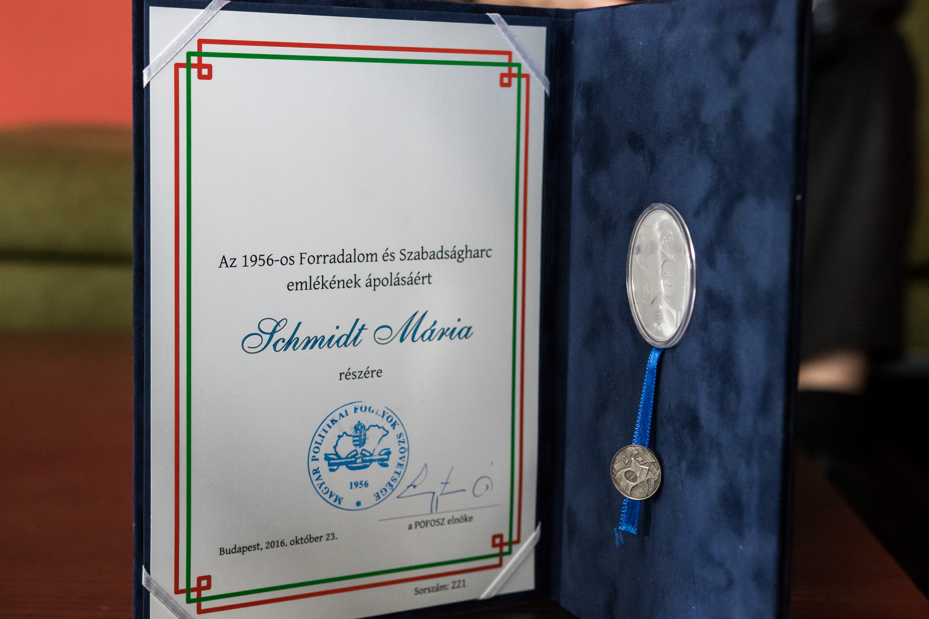 Schmidt Máriának Lengyel János, a POFOSZ országos elnöke és Forgács János, kitüntetésekért felelős elnökhelyettes adta át az elismerést a Terror Háza Múzeumban.