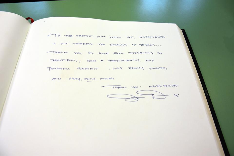 Justin Theroux a következőket írta a Terror Háza Múzeum vendégkönyvébe: „A Terror Háza Múzeum dolgozóinak, és azoknak, akik mindezt létrehozták… Nagyon köszönöm, hogy ilyen megragadóan mutatták be ezt a szívszorító és elementáris erejű kiállítást. Mélyen megérintett és nagyon meghatott. Köszönöm. Soha nem felejtem el. Justin Theroux". / "To the people who work at, assembled, and put together the Museum of Terror… Thank you so much for presenting so beautifully, such a heartbreaking and powerful exhibit. I was deeply touched and very very moved. Thank you. Never forget. Justin Theroux".