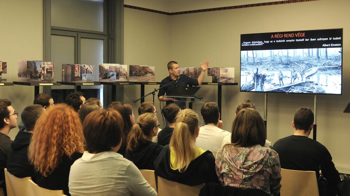 Az előadások között a diákok kísérőtanáraikkal együtt megtekinthették Varga Csaba fotóművész 56 Múlt és Jelen – Képes időutazás című könyvének fotóiból készült időszaki kiállításunkat, amely 2017. november 5-ig látható a Terror Háza Múzeumban.
