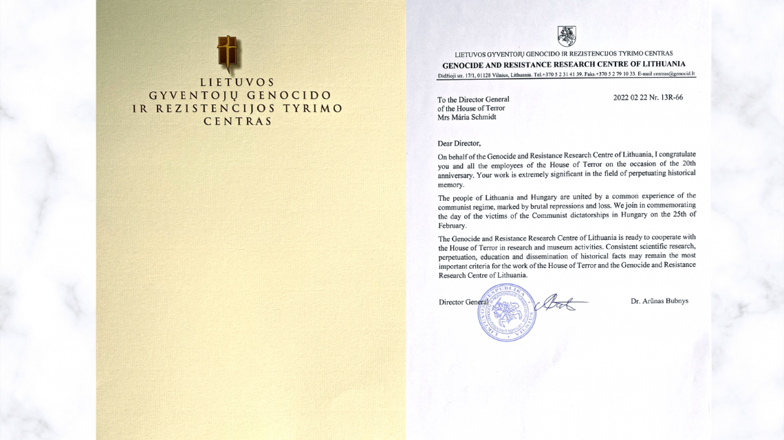 Levélben fejezte ki gratulációját a Terror Háza Múzeum húszéves fennállásának apropóján Arūnas Bubnys, a Litvániai Népirtás és Ellenállás Kutatóközpont főigazgatója. Az intézményvezető Schmidt Mária főigazgató asszonynak címzett levelében úgy fogalmazott, „Az Önök munkája rendkívül jelentős a történelmi emlékezet megörökítése terén.”