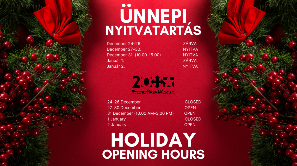 Felhívjuk tisztelt látogatóink figyelmét, hogy az ünnepi időszakban múzeumunk nyitvatartása az alábbiak szerint alakul.
