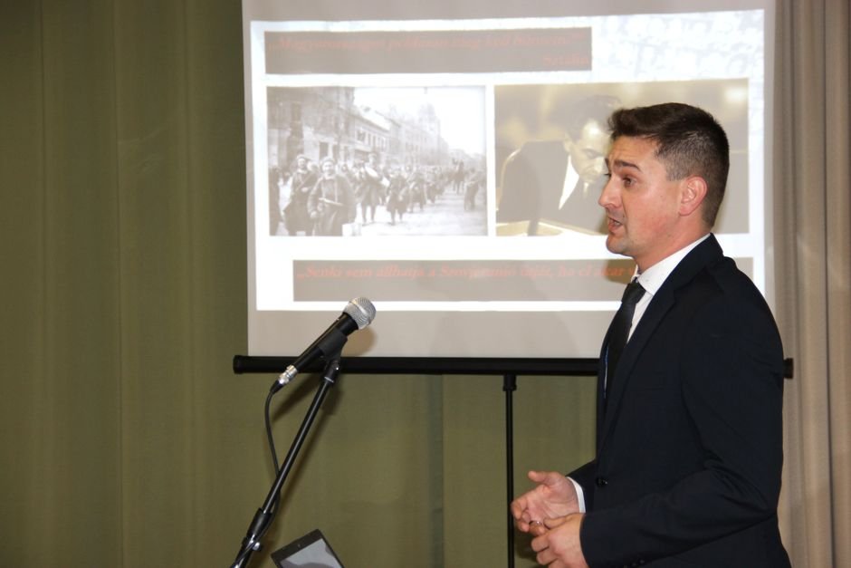 A kommunizmus „megalapozását” jelentő szovjet megszállás képei jelentek meg a vetítővásznon, s a szónok idézte a diktátort, Sztálint, aki már 1943-ban, a második világháború ideje alatt kijelentette, hogy Magyarországot meg kell büntetni. Balogh Gábor a februári zirci előadása során részleteiben már kitért rá, de most sem mehetett el szó nélkül a Szovjetunió kényszermunkatáboraiba, a GULAG-ra elhurcolt több mint hétszázezer magyar ember története mellett, akik közül háromszázezren soha nem tértek haza.