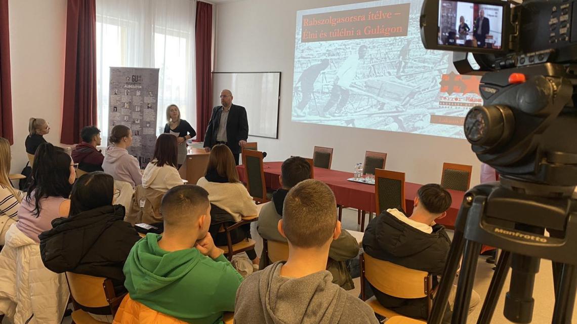 – A Terror Háza Múzeum egyik új kezdeményezése a Házhoz megy a múzeum elnevezésű program, amelynek az a lényege, hogy időszaki kiállításokat viszünk külső helyszínekre. November 25-e a magyarországi politikai foglyok, illetve kényszermunkatáborokba hurcolt foglyok emléknapja, ennek kapcsán itt, a református gimnáziumban rendhagyó történelemóra keretében igyekeztem bemutatni, hogy milyen volt az élet a Gulagon. Kezdve onnan, hogy miként alakultak ki a szovjet kényszermunkatáborok, illetve rátértem arra, hogy Magyarországon miért és hogyan hurcolták el az embereket, illetve milyen volt az odaút, s milyen körülmények között éltek a különböző kényszermunkatáborokban, és hogyan tértek haza onnan az emberek – fogalmazott az előadást tartó Lakatos Dorina, a Terror Háza Múzeum történésze.