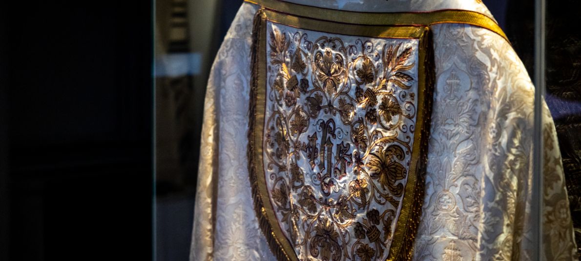 A Felekezetek terme bejáratával szemben, a ledöntött kereszt installációjának csúcsánál Mindszenty József bíboros, hercegprímás, esztergomi érsek palástját láthatjuk kiállítva. Mindszenty a magyar antikommunista ellenállás központi figurája volt.